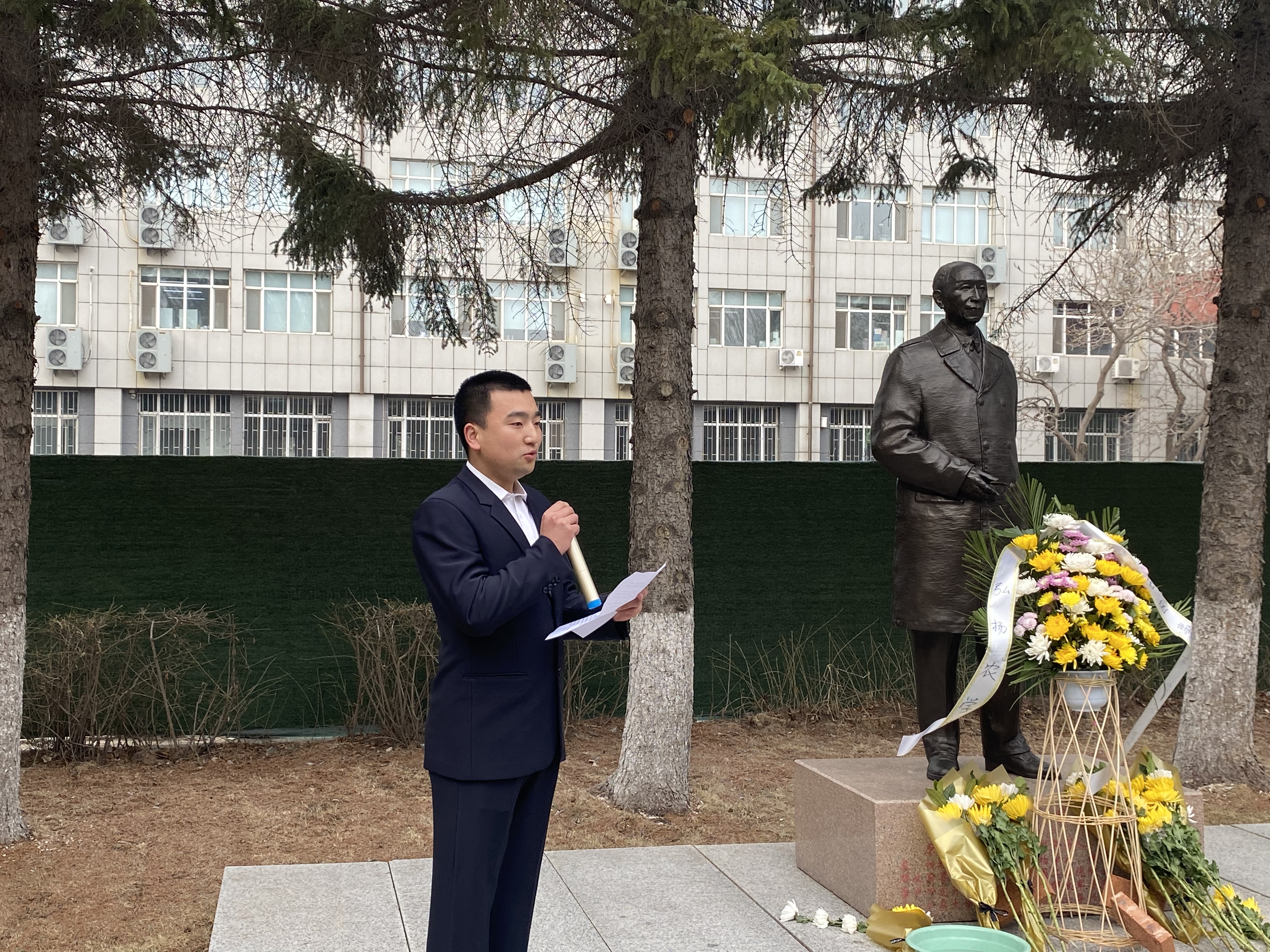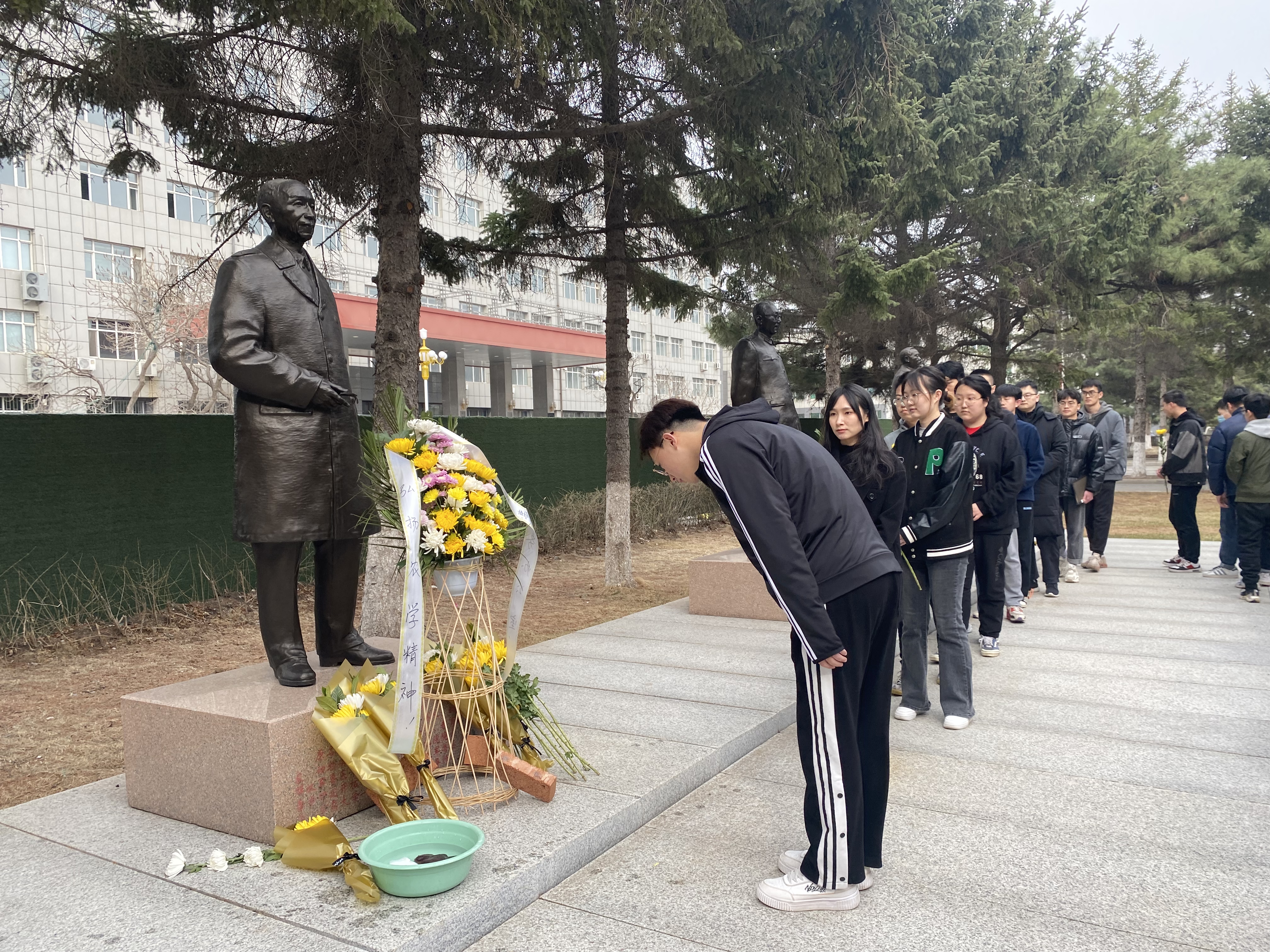碧空如洗,松柏苍翠,庄严肃穆,先贤铜像巍峨耸立。在慷慨激昂的国歌声中,在场师生身着黑色衣服肃立,深切缅怀吉林大学“徐华清、任抟九、殷震”三位先贤,感念先贤付出,追慕先贤精神,赓续先贤力量。到场师生在先贤铜像前依次敬献鲜花并默哀一分钟。学生代表分别为三位先贤擦拭铜像,以此表达对先贤的敬仰和哀思。